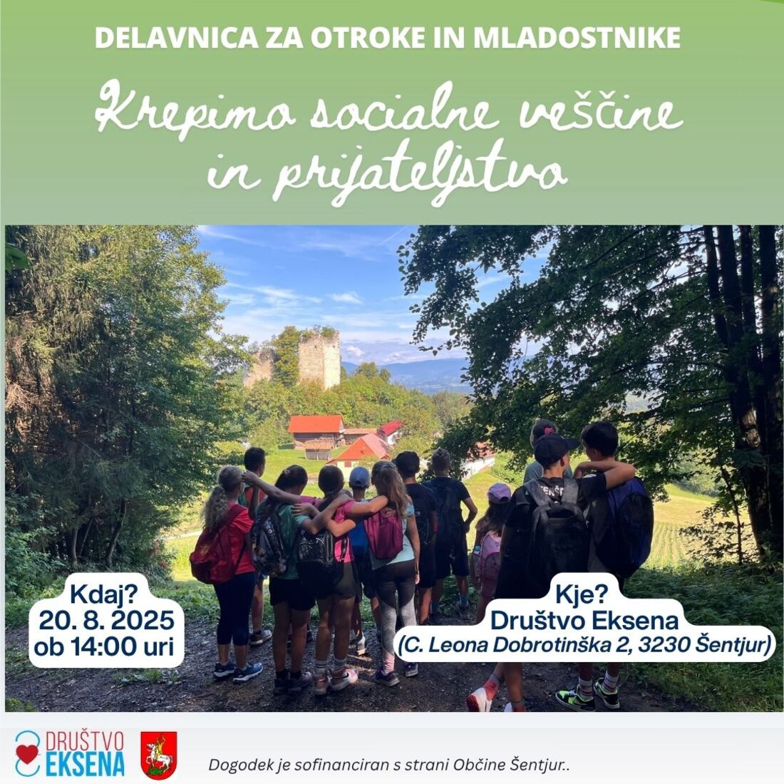 Delavnica bo potekala v sredo, 20. 8. 2025, ob 14:00 v Društvu za strpne odnose Eksena, (C. Leona Dobrotinška 2, 3230 Šentjur).