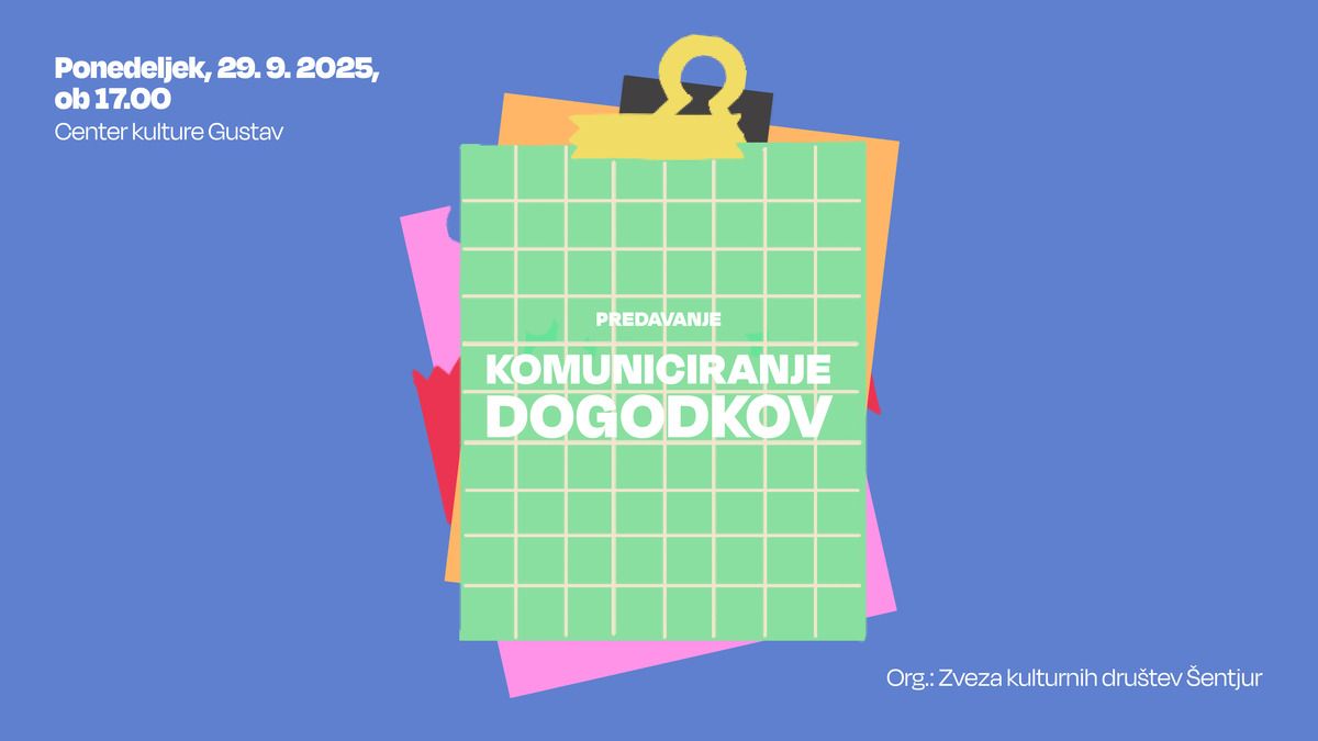 Zveza kulturnih društev Šentjur vabi vsa društva na predavanje Komuniciranje dogodkov, ki bo v ponedeljek, 29. septembra 2025, ob 17. uri v Centru kulture Gustav.