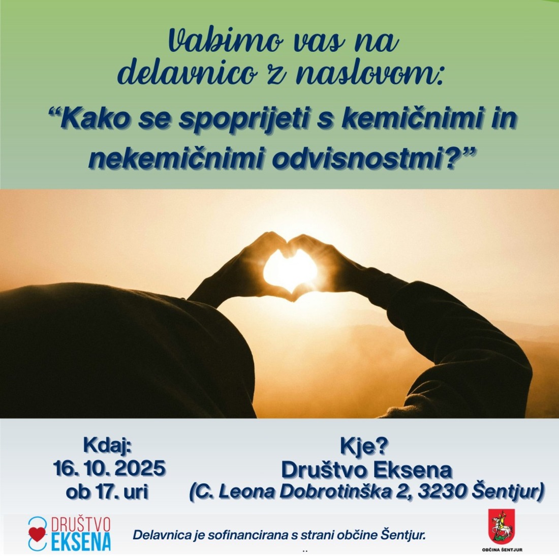 Društvo za strpne odnose vas vabi na delavnico Kako se spoprijeti s kemičnimi in nekemičnimi odvisnostmi, ki bo potekala v četrtek, 16. oktobra 2025, ob 17. uri.