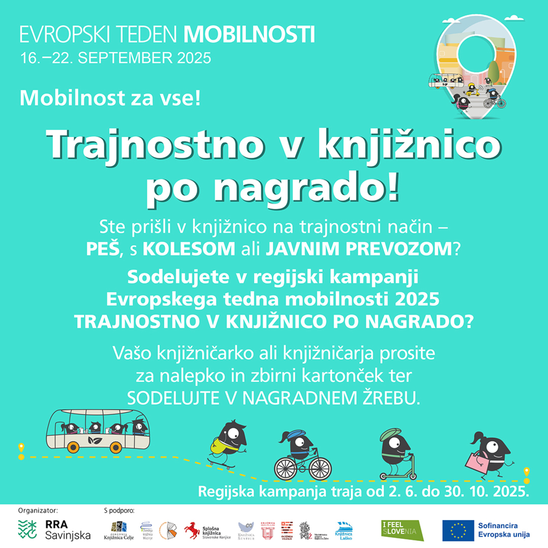 Regijski center mobilnosti Savinjska, ki deluje v okviru Regionalne razvojne agencije Savinjska, v sodelovanju s knjižnicami Savinjske regije v okviru Evropskega tedna mobilnosti 2025 organizira kampanjo Trajnostno v knjižnico po nagrado!, ki je namenjena spodbujanju spreminjanja vsakodnevnih potovalnih navad in trajnostnega prihoda v knjižnico.