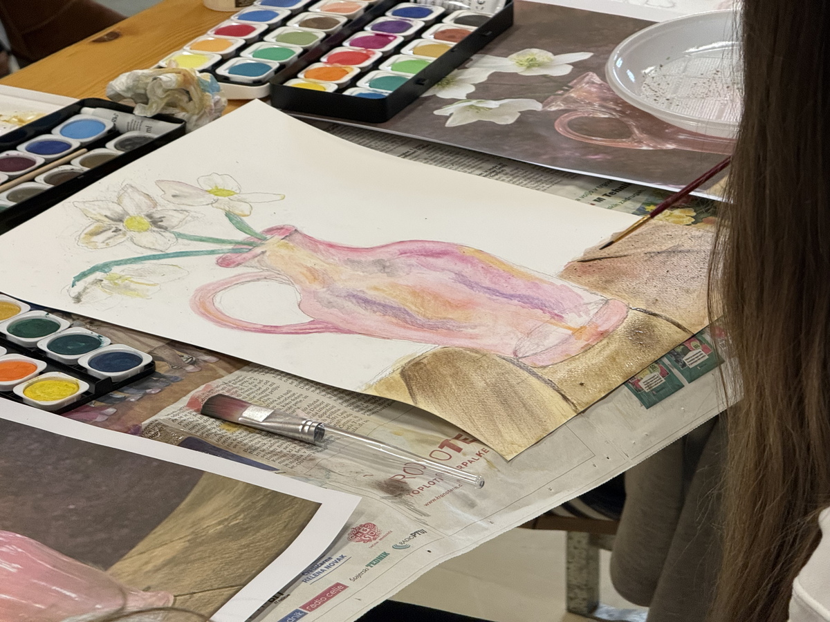 Udeleženci delavnice, pa so z vodenimi barvicami po predlogi ustvarjali tihožitje - črni teloh v stekleni vazi. Vaza je izdelek iz glažut ki so delovale v Loki pri Žusmu v 18. in 19. stoletju. Pod strokovnim vodstvom so nastale številne umetnine, ki bodo krasile Galerijo Zgornji trg od 8. marca 2026 pa vse do začetka aprila.