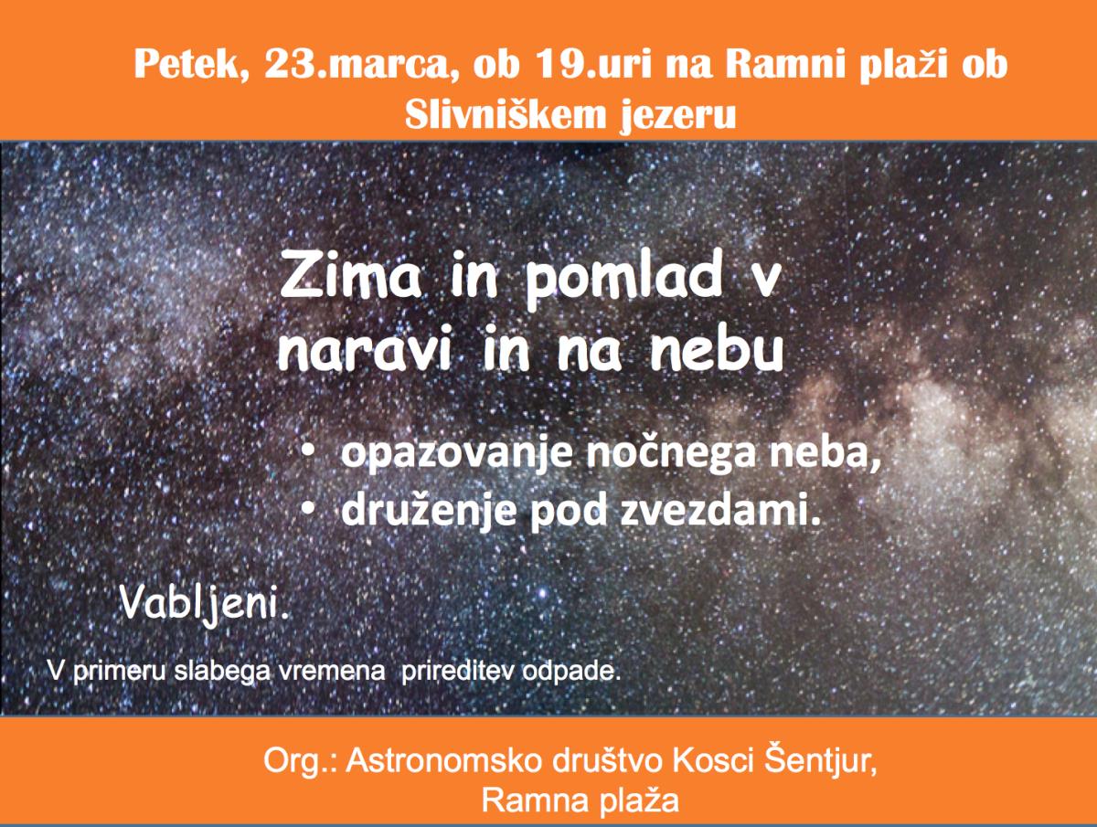 Člani astronomskega društva Kosci Šentjur in kolektiv Ramne vas vabimo na prireditev Zima in pomlad v naravi in na nebu. Opazovanje zimsko-pomladnega nočnega neba bomo izvedli v petek, 23. 3. 2018, od 19. ure naprej. Vse javne prireditve Astronomskega društva Kosci Šentjur so brezplačne.