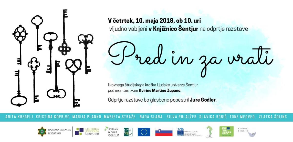 Odprli bomo že 4. likovno razstavo naših likovnikov pod mentorstvom Kvirine Martine Zupanc, na kateri se bodo predstavili z likovnimi deli s pomenljivim naslovom Pred in za vrati. Upodabljali so krajevne skupnosti občine Šentjur, torej tisto, kar je pred vrati, notranjost kulturno pomembnih objektov v naši občini, in tisto, kar je za vrati. S tem so se poklonili Evropskemu letu kulturne dediščine. Razstava bo na ogled v Knjižnici Šentjur.