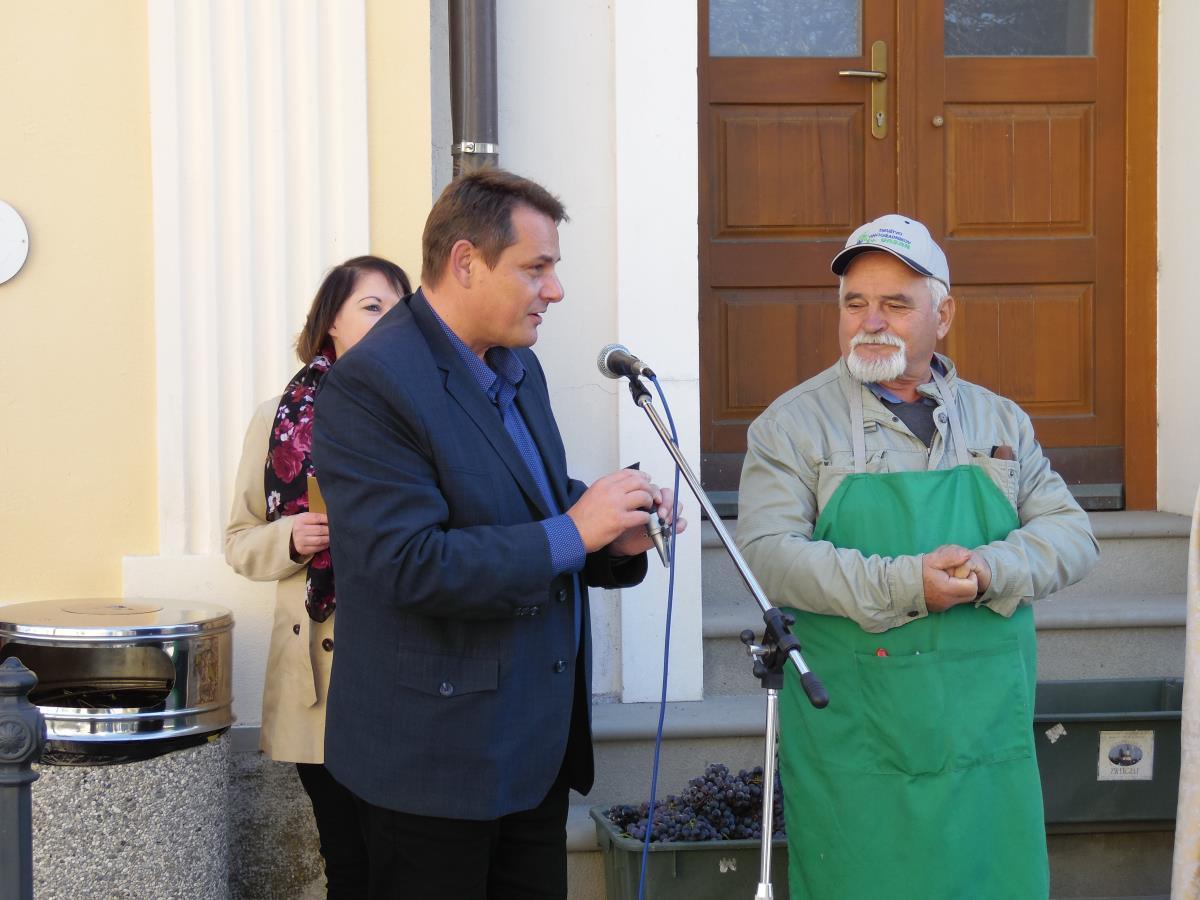Medtem, ko so v večini vinorodnih krajev že potrgali sladko grozdje, sta trgatev tudi sredi Šentjurja zaukazala gospodar trte, župan mag. Marko Diaci in mestni viničar Jurij Malovrh. Zbralo se je lepo število prijateljev vinske trte in vinogradnikov, ki so počastili ta dogodek. Župan mag. Marko Diaci je uvodoma poudaril pomen skrbi za kulturno dediščino v Evropskem letu kulturne dediščine, med kar sodi tako prenova vrta Ipavčeve hiše, kot tudi skrb za samo trto. Omenil je tudi 110-letnico smrti Benjamina in Gustava Ipavca ter aktivnosti v okviru članstva v Združenju zgodovinskih mest. Vsem skupaj pa je zaželel dobro delo v kleti in odlično vinsko letino. Ta, sodeč po optimizmu vinogradnikov, res ne bo slaba, kot je povedala tudi še aktualna vinska kraljica sv. Helene Sabina Mansutti, ki je izročila prijazne pozdrave in zbrane povabila na tradicionalno prireditev Martin na star način, v Javorju, na Sveti Heleni. Nato se je pričelo delo – trgatev, ki se je odvijalo v prijetnem vzdušju in avtentični godbi, za kar sta poskrbela člana Mladinske folklorne skupine Lintvar, godca Žan Trupej in Žan Vodeb. Trta je letos rodila 419 grozdov in vse so lahko pozobali obiskovalci. Že prej sta jih večino skrbno potrgala Edi Krajnc in g. Žmahar iz vinogradniškega društva. Vsi prijatelji šentjurske modre kavčine so se odpravili zatem še na »likof« na Ipavčevem vrtu, in si ogledali aktualno gradbišče. Naslednje leto pa se bodo že lahko sprehodili po krožni poti in skozi nov paviljon.
