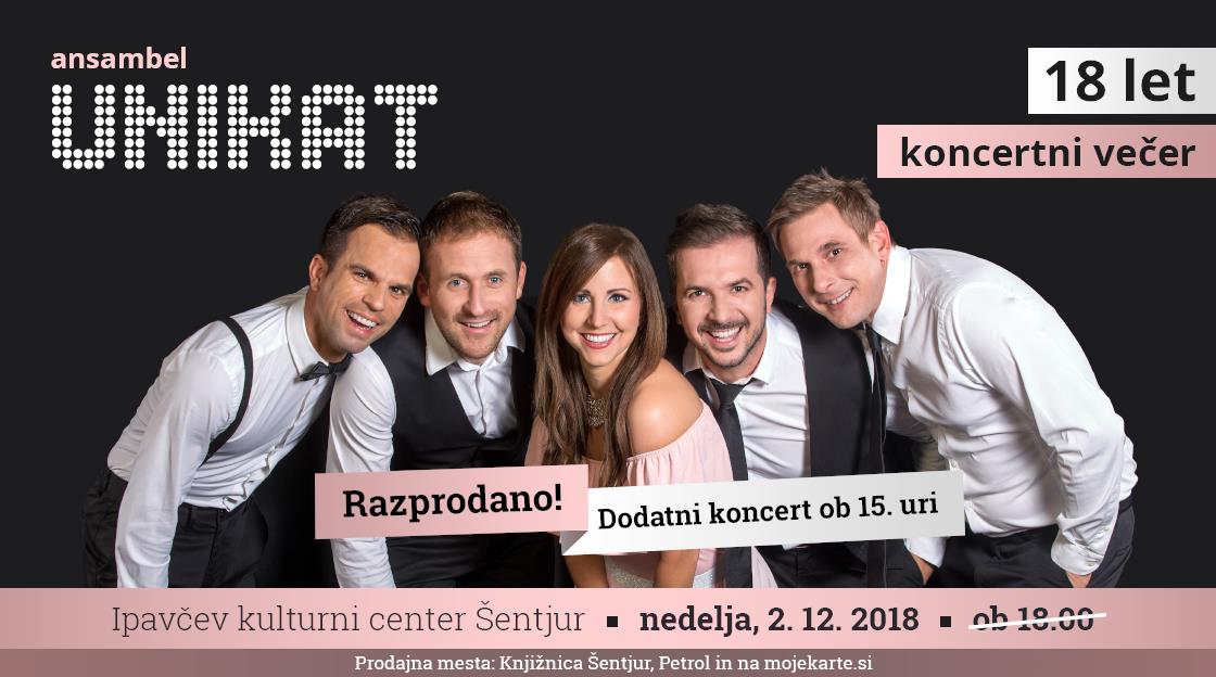 V nedeljo, 2. decembra 2018, ob 15.00 in 18.00 vabljeni v veliko dvorano Ipavčevega kulturnega centra v Šentjur na koncertni večer ob prelomnici ansambla Unikat – 18 let. Ob svoji polnoletnosti so vam pripravili koncert, kjer bo mogoče slišati njihove največje uspešnice, kot so Kar je moje, je tvoje, Srce ne razume, Ne cukaj me za kitke idr., pa tudi kakšno čisto novo skladbo so pripravili. Slišati bo mogoče tudi kar nekaj priredb v akustičnem zvenu, kar pomeni, da koncert ne bo klasično narodno-zabaven. Večer bo poln spominov na njihovo prehojeno pot.