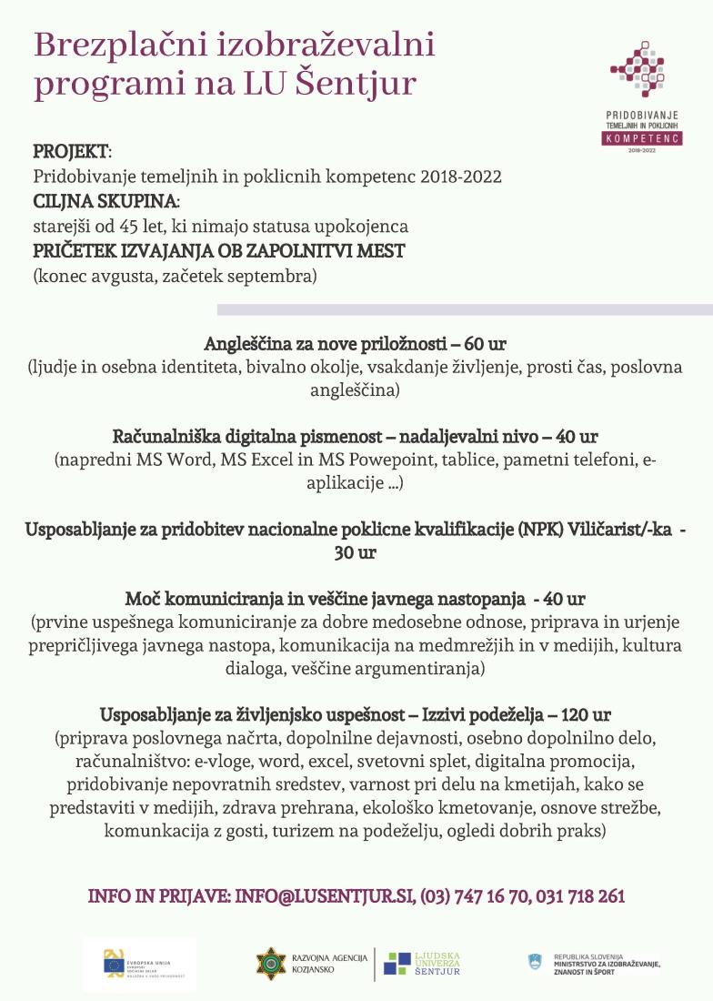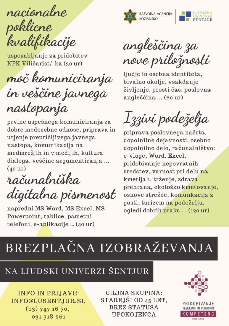 V septembru, oziroma takoj, ko se zapolni dovolj učnih mest, bodo tako na Ljudski univerzi Šentjur pričeli z izvajanjem programa za pridobitev nacionalne poklicne kvalifikacije viličarist, angleščina in francoščina na začetni stopnji, moč komunikacije ter digitalne kompetence na različnih stopnjah za jesenski termin. Ciljna populacija je nad 45 let (brez statusa upokojenca), med zanimivimi brezplačnimi izobraževanji pa najdemo tudi veščine javnega nastopanja ter usposabljanje za življenjsko uspešnost – izzivi podeželja. Pohitite z vpisom in si zagotovite mesto ter s septembrom stopite na pot novih znanj!