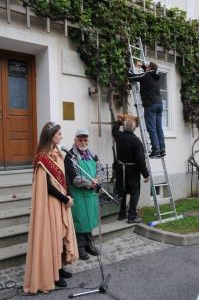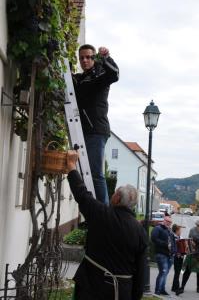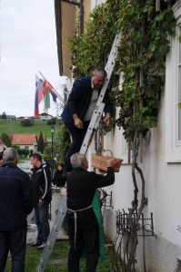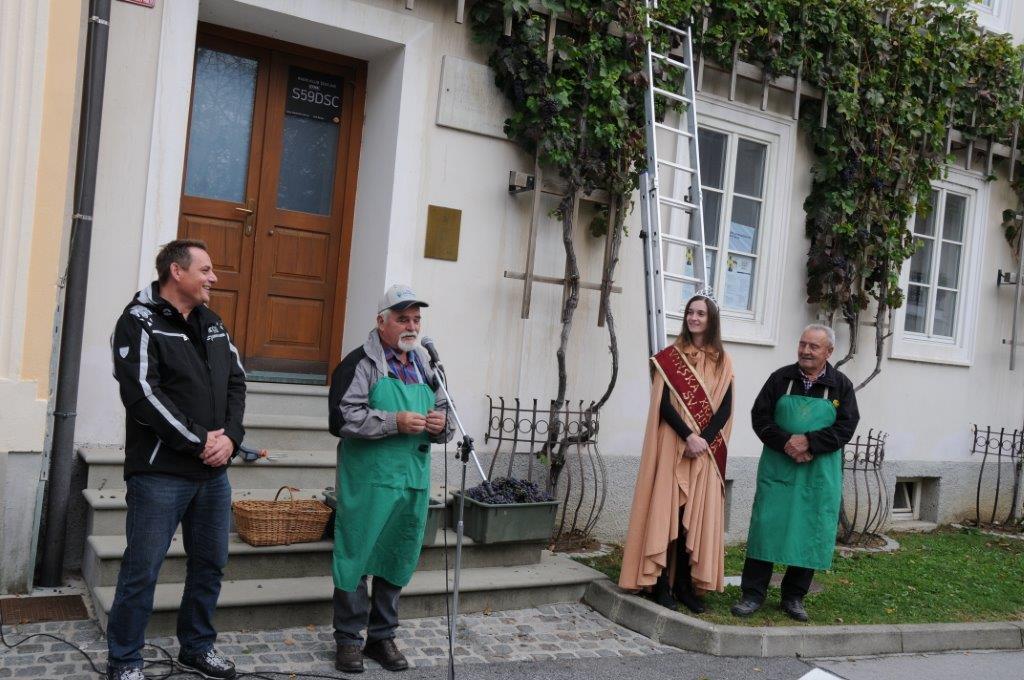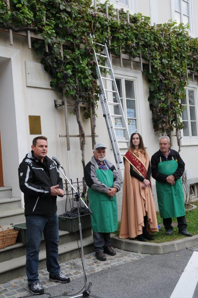 Župan mag. Marko Diaci je v četrtek, 3. oktobra pripravil tradicionalno trgatev protokolarne trte, ki je bila tokrat združena z Dnevi evropske kulturne dediščine v organizaciji Društva Skrinja z nastopom Mladinske folklorne skupine Lintvar.