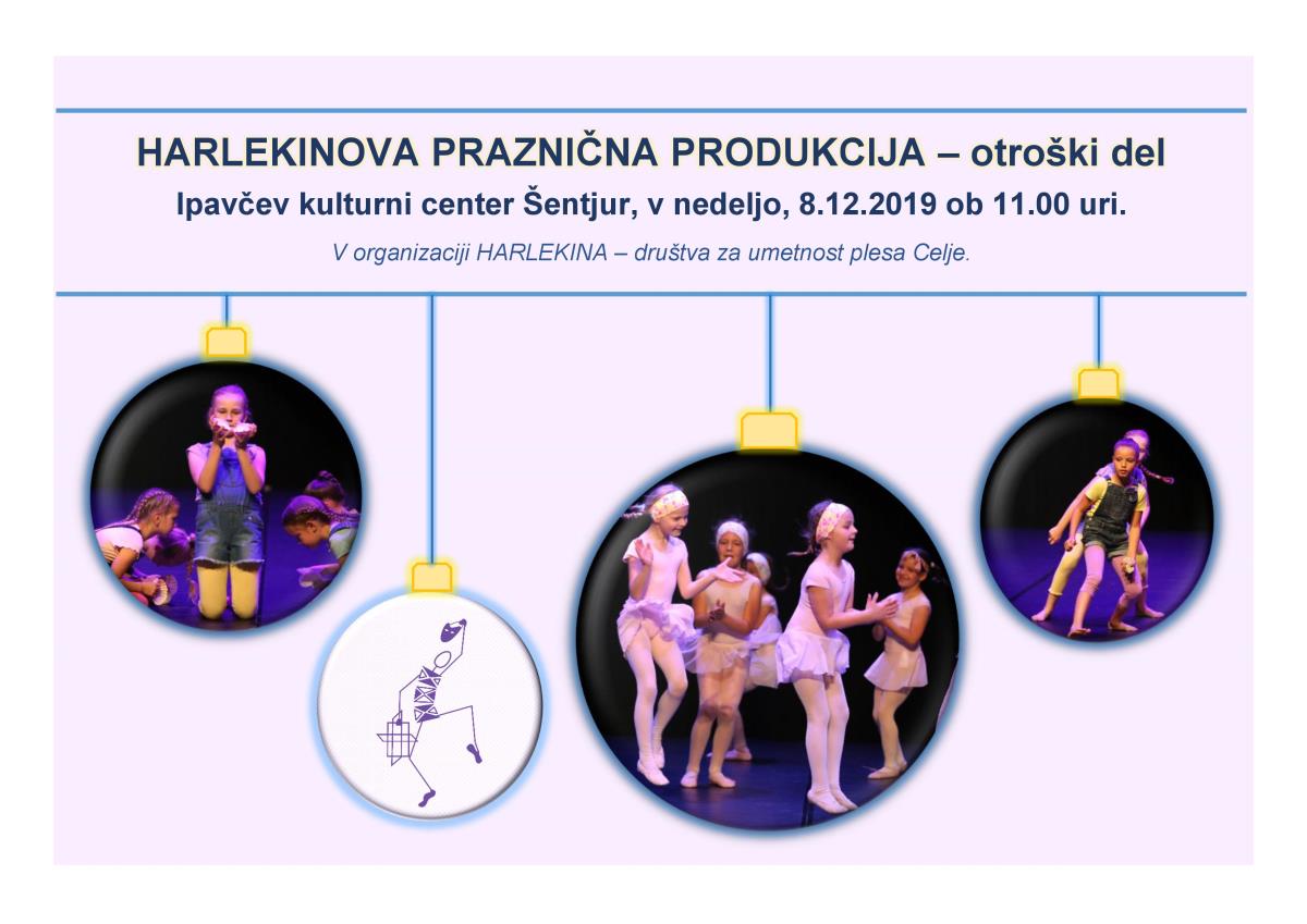 V nedeljo, 8. 12. 2019, vas lepo vabimo na ogled HARLEKINOVE PRAZNIČNE PRODUKCIJE - otroški del, kjer se vam bodo ob 11. uri predstavili najmlajši plesalci Harlekina - društva za umetnost plesa iz Celja. Prireditev bo potekala v veliki dvorani Ipavčevega kulturnega centra Šentjur.