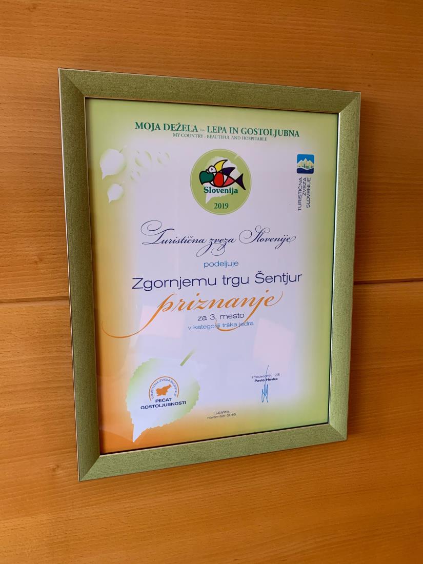 Občina Šentjur je letos ponovno sodelovala v vseslovenski akciji Turistične zveze Slovenije Moja dežela – lepa in gostoljubna. Zgornji trg se je uvrstil na tretje mesto med nominiranimi trškimi jedri iz Slovenije. »Šentjur je bil za urejanje svojega jedra Zgornji trg že izbran za najlepše trško jedro v Sloveniji. Komisija letos izpostavlja nov kiosk na trgu in ureditev parka pod glasbeno šolo v funkcionalno oblikovan zunanji prostor za poroke in druge posebne prireditve. Tudi sicer Občina Šentjur stavi predvsem na štiri turistične stebre – zapuščino skladateljev in zdravnikov Ipavcev (v navezavi z ohranjeno in prenovljeno arhitekturo starega trškega jedra Zgornjega trga), Slomška (v navezavi na romarski turizem na Ponikvi), na Slivniško jezero kot rekreativno-pohodniško-ribolovni biser z velikim potencialom ter na edinstveno arheološko zapuščino Rifnika,« je bilo med drugim navedeno v obrazložitvi. Priznanje sta na osrednji slovesnosti v Ljubljani prevzela župan mag. Marko Diaci in predsednik sveta Mestne skupnosti Šentjur Zdenko Horvat.