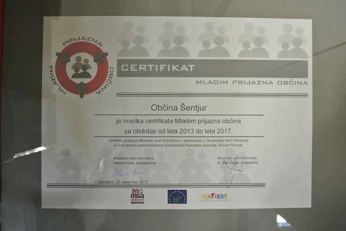 Spomnimo, da je certifikat Mladim prijazna občina priznanje samoupravnim lokalnim skupnostim, ki uspešno izvajajo ukrepe s področja vertikalnih in horizontalnih mladinskih politik, podeljuje pa se lokalnim skupnostim, ki jih strokovna komisija na podlagi razpisa prepozna kot mladim prijazne, ker so v minulih dveh letih uspešno izvajale ukrepe s področja lokalnih mladinskih politik. Občina Šentjur je tako morala prikazati dolgoročne strategije in konkretne ukrepe pri vzpostavljanju mladim prijaznejšega okolja, pri čemer izstopajo področja mladinskih politik, politik izobraževanja, zaposlovanja, informiranja, mobilnosti, stanovanjske politike, participacije mladih in mladinskega organiziranja. V Občini Šentjur smo na pridobljeni certifikat ponosni, s podpisom dogovora pa je bila dana tudi obveza, da se ohrani obstoječi nivo ukrepov s področja lokalnih mladinskih politik. Vsekakor pa ga bo Občina Šentjur poskušala še nadgraditi.