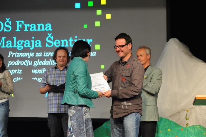 Osnovno šolo FRANJA MALGAJA ŠENTJUR je komisija nominirala ZA IZJEMNE DOSEŽKE NA PODROČJU GLEDALIŠKE DEJAVNOSTI in RECITATORSTVA, kar dokazuje njeno nadpovprečno uspešnost. Šola deluje na skoraj vseh vejah umetnosti (glasba, literatura, film, ples, slikarstvo ...). Povedati je treba, da so na mnogih področjih inovativni, saj ne posegajo po delih, ki so že narejena in pripravljena za poustvarjanje umetnosti, ampakustvarjajo svoje lastne gledališke igre, adaptacije književnih del v dramska, pripravljajo avtorske scenarije za snemanje filma... Tako želijo svojim ustvarjanjem na eni strani preseči osnovnošolske standarde v umetnosti, po drugi strani pa skušajo svoja dela vsako leto nadgrajevati. Odličen primer tovrstnega njihovega dela je lanskoletna predstava »Rekel je, da bo pesnik«, ki je dobila odlične kritike selektorjev lanskoletnih Živih besed in bila ednina osnovnošolska predstava, ki je bila povabljena na srednješolski Festival Vizije. Z zavidljivo mero govorne artikulacije ter izčiščeno, neprisiljeno, naravno in tekočo dikcijo priborili celo Vizionarja. Njihov največi prodor zaznavamo prav na področju ugledališčene poezije, s katero orjejo ledino na šolskih odrih.