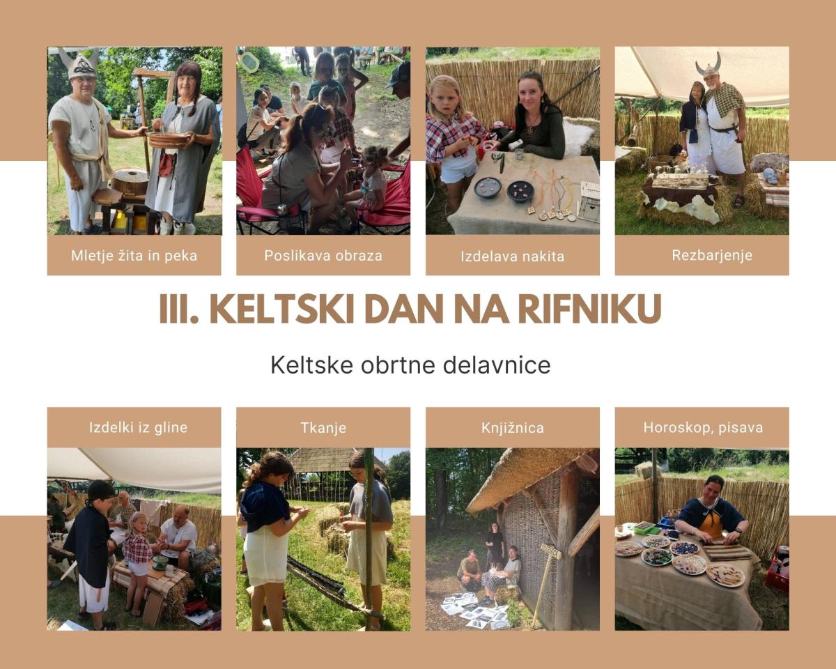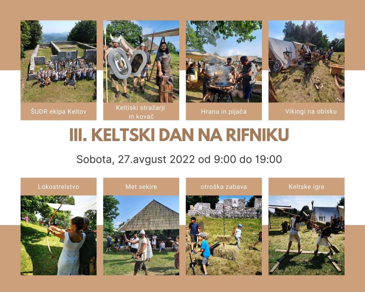 𝙆𝙚𝙡𝙩𝙨𝙠𝙞 𝙙𝙖𝙣 𝙣𝙖 𝙍𝙞𝙛𝙣𝙞𝙠𝙪 bo letos še bolj keltski in izviren. Organizatorji, člani Športno umetniškega društva Rifnik, smo že zavihali rokave in se pripravljamo na prireditev, ki bo povezala vse generacije. Obiskali boste lahko različne delavnice in se preizkusili v lokostrelstvu ali pa se naučili novih veščin, kot je rezbarjenje, kovaštvo, tkanje, lončarstvo … Lahko boste odkrivali skrivnostno zgodovino Rifnika in se okrepčali s keltsko enolončnico ali posladkali s keltskimi palačinkami in pražencem ter osvežili v keltski točilnici.