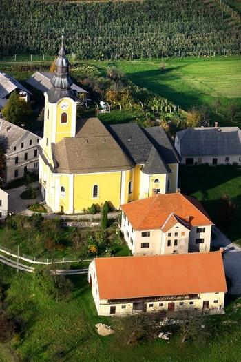 Prvotno je bila na tej lokaciji arhivsko izpričana že romanska cerkev. Današnja, baročna je bila zgrajena med letoma 1732 in 1758, dve leti kasneje pa je bila tudi posvečena in spada med cerkve sladkogorskega tipa. Pravokotni ladji z nadzidanim zvonikom sledi enako visok, ožji prezbiterij, ki ima na severni strani prizidano kapelo in shrambo. Cerkev obiskovalce preseneča s svojo velikostjo, saj njena celotna dolžina znaša kar 35 m in njena širina 18 m. V notranjosti nas navdušuje bogata baročna oprema – monumentalna prižnica slovite rezbarske družine Mersijev ter freske Jakoba Brolla, ki jih je ustvaril leta 1890. Med pomembno cerkveno opremo spada tudi srebrn Slomškov kelih ter relikvija svetega križa, ki je vdelana v kristal.