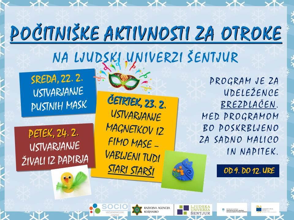 V prostorih LUŠ so do konca tedna med 9. in 12. uro dobrodošli otroci, starejši od 6 let. Otrokom so namenjene ustvarjalne aktivnosti, danes so tako že izdelovali pustne maske ob sadnih prigrizkih in napitkih. Jutri, v četrtek na delavnici z otroki dobrodošli tudi babice in dedki, saj je druženje medgeneracijsko zasnovano, skupaj boste lahko izdelali magnetke iz fimo mase. V petek bodo otroci ustvarjali živali iz papirja. LUŠ počitniške aktivnosti izvaja kot partner Večgeneracijskega centra Celje.