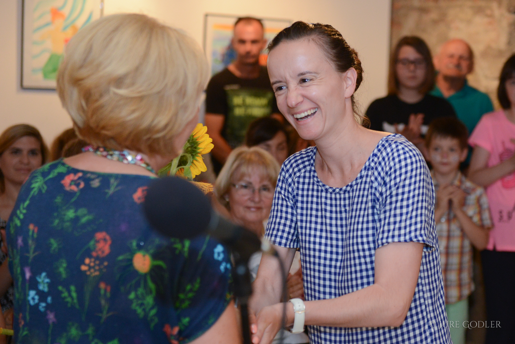 Tadej Žugman je navezan tudi na Šentjur, saj sta v hiš, kjer je sedaj galerija, živela njegova dedek in babica. Tudi kasneje se je pogosto vračal k sorodnikov v »njegov drug rojstni kraj«, zato je razstavo posvetil članom rodbine Čretnik. Odprtje razstave je bilo v znamenju sproščenega pogovora z avtorjem, odličnega nastopa vokalistk GŠ skladateljev Ipavcev Šentjur ter pripovedi spominov iz mladosti družine Čretnik, ki sta jih obiskovalcem zaupala tako avtor kot tudi njegov stric Karl Čretnik.